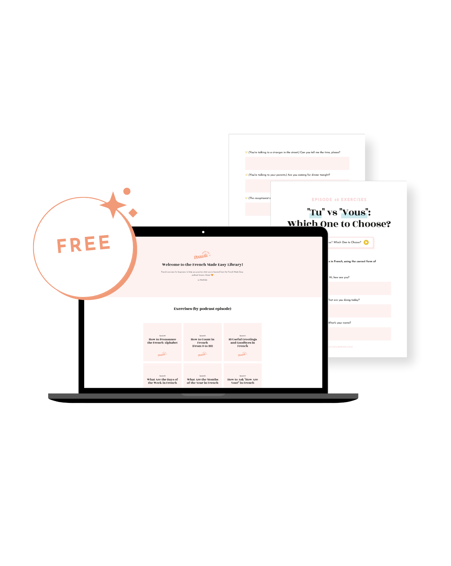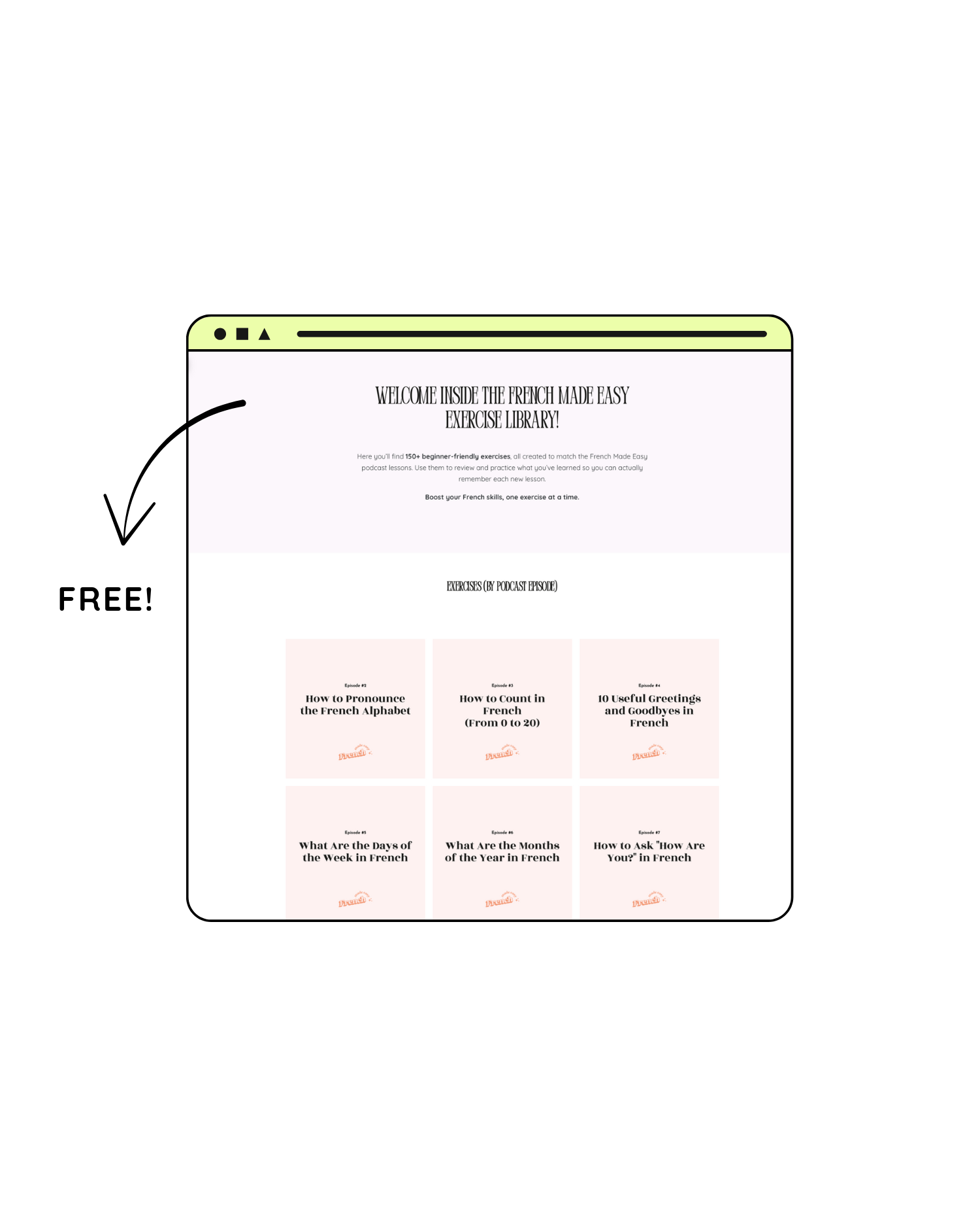 Get access to 150+ FREE practice exercises from the French Made Easy podcast, to help you practice and progress!